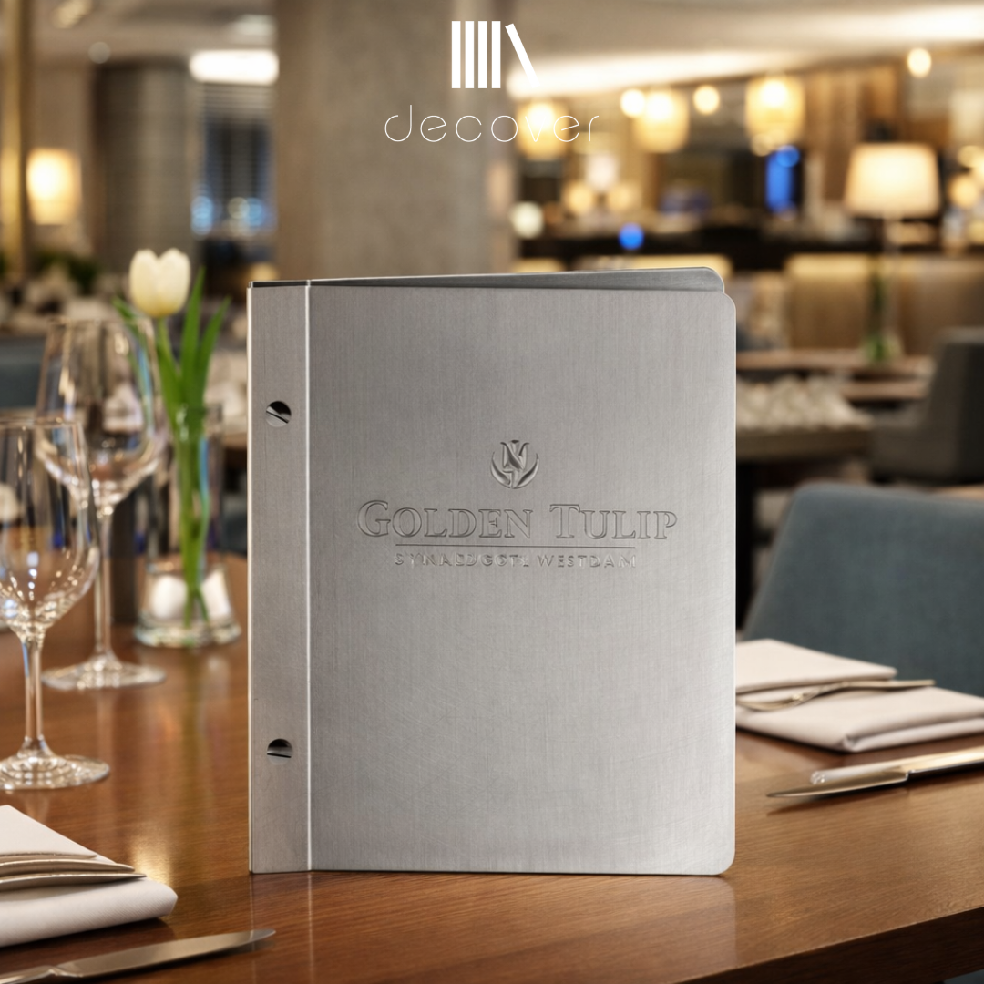 In einem Hotelambiente sorgt diese A5-Speisekarte mit Buchschrauben für einen soliden und eleganten Look.