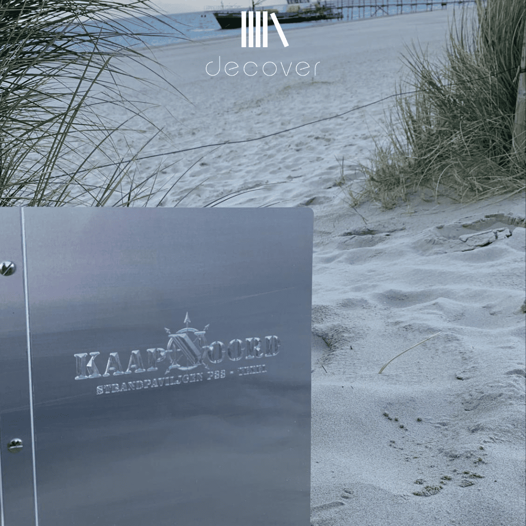 Voor Kaap Noord mochten we een stoere menukaart maken. Deze glad metalen variant op A4 formaat is voorzien van boekschroeven.